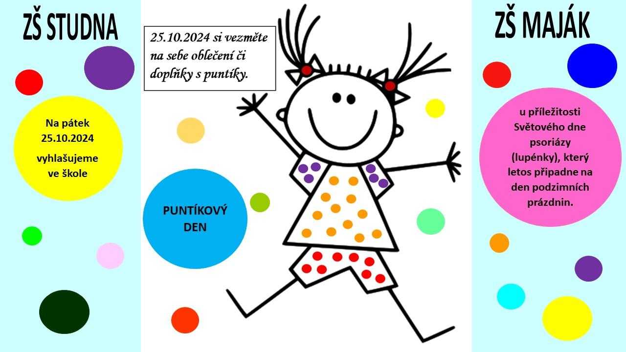 Prosíme rodiče, aby dětem připravili na pátek 25.10.2024 puntíkované oblečení nebo doplňky v daném stylu. Třídní kolektivy se pak pochlubí prostřednictvím fotografií, jak PUNTÍKOVÁ ATMOSFÉRA A PUNTÍKOVÝ DEN ve škole probíhal.