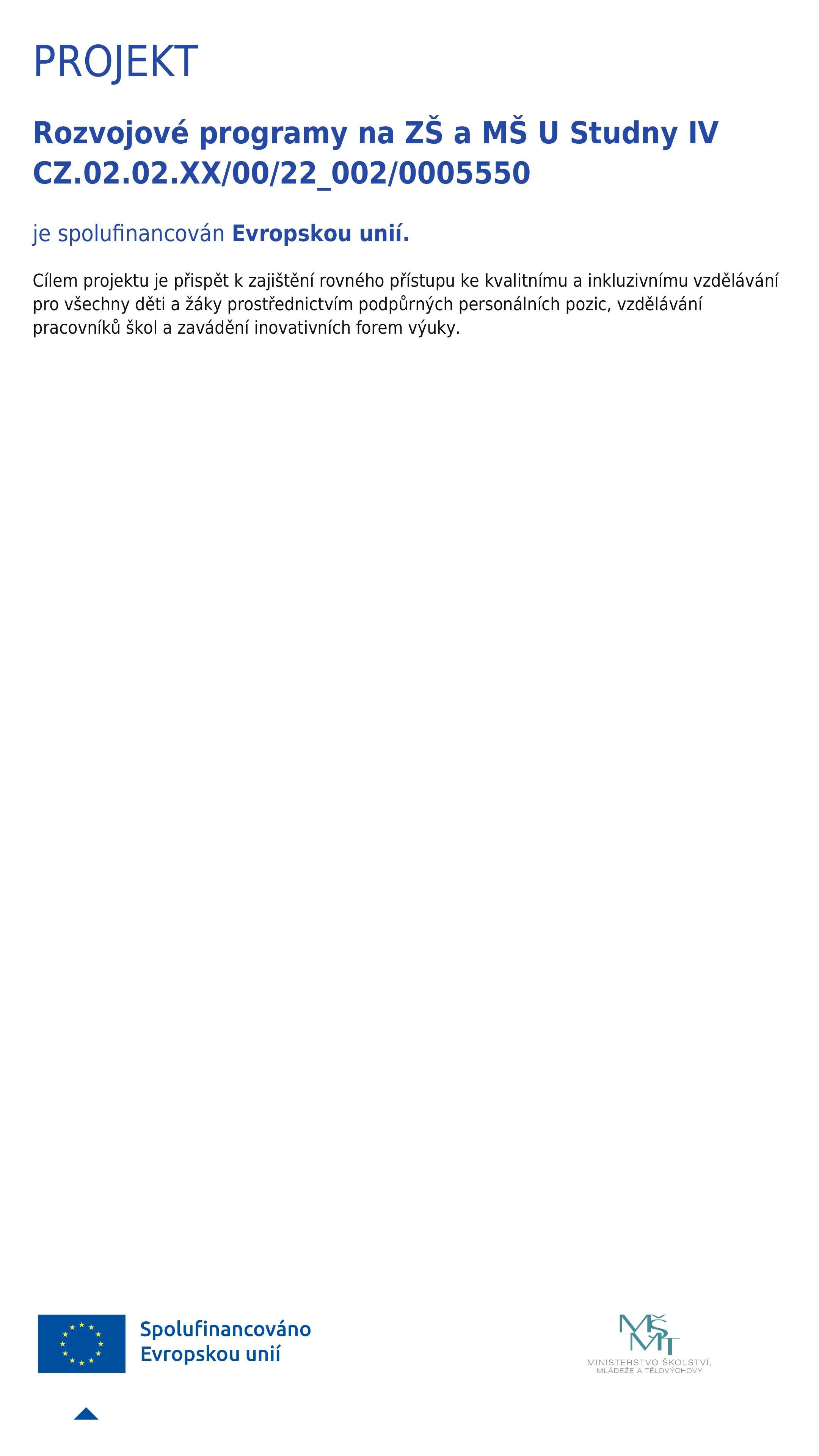 Cílem tohoto projektu je přispět k zajištění rovného přístupu ke kvalitnímu a inkluzivnímu vzdělávání pro všechny děti a žáky prostřednictvím podpůrných personálních pozic, vzdělávání pracovníků škol a zavádění inovativních forem výuky.