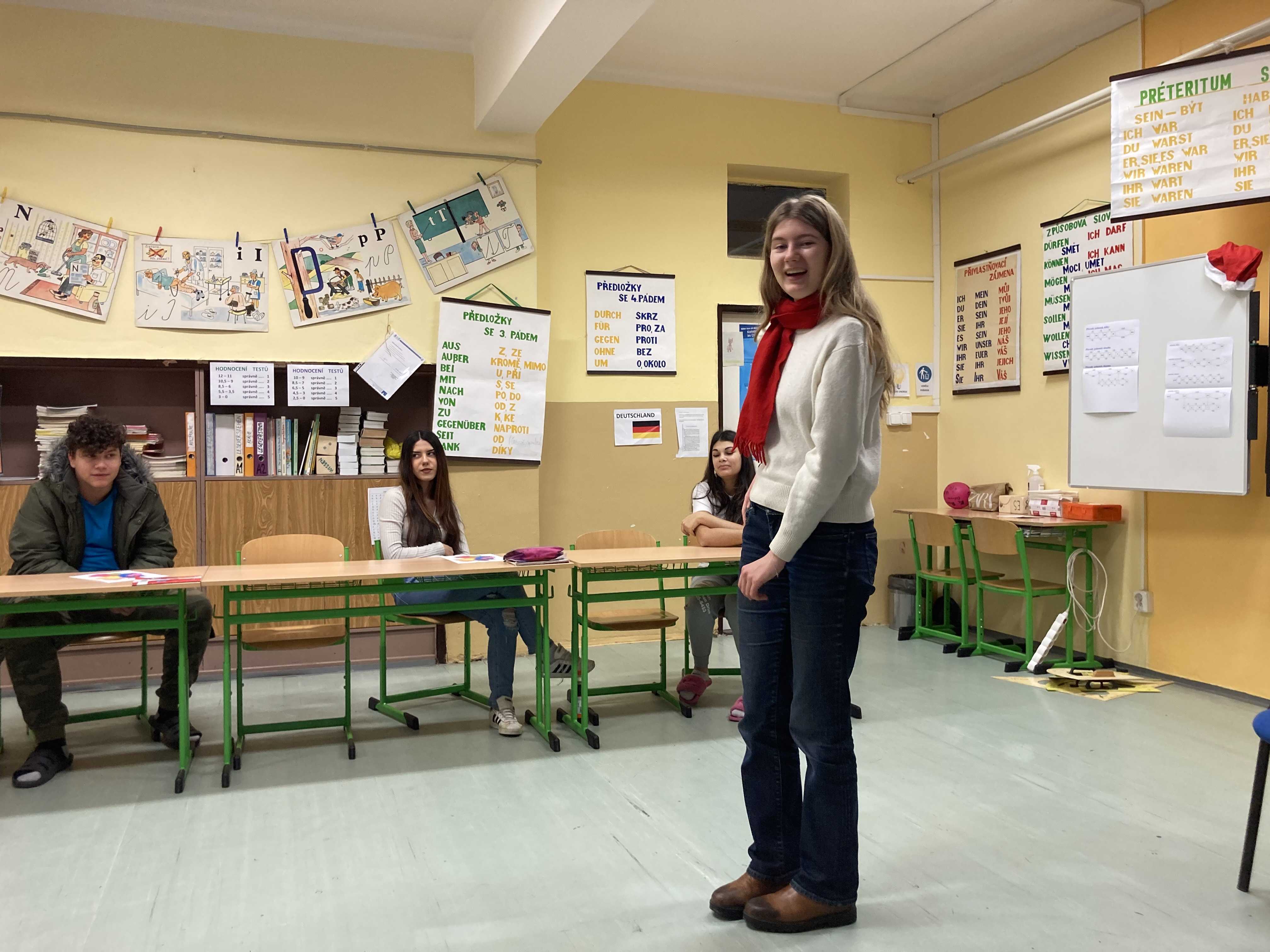 Dnes naši školu navštívila rodilá mluvčí Olga z Německa, která si pro žáky 8. a 9. třídy připravila vyučovací hodinu na téma „Představ se.“ Byla to úžasná příležitost si popovídat a vyzkoušet si, co už umí. Těšíme se na příští setkání v lednu