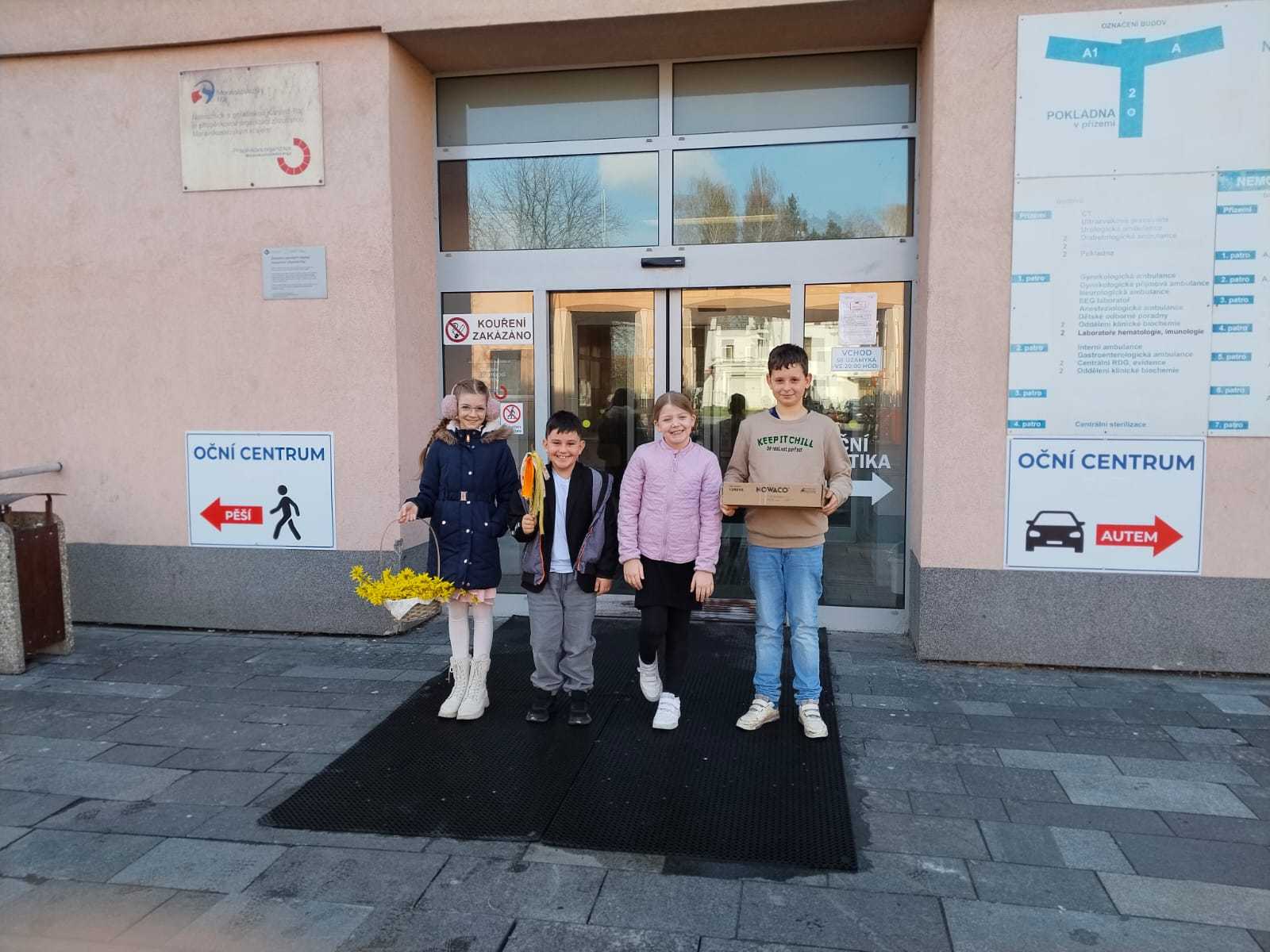 Děti z naší školy navštívily pacienty v LDN, aby jim zpříjemnily předvelikonoční čas. Přinesly s sebou kytičky zlatého deště, vlastnoručně vyrobená velikonoční přáníčka a drobné dárečky.
